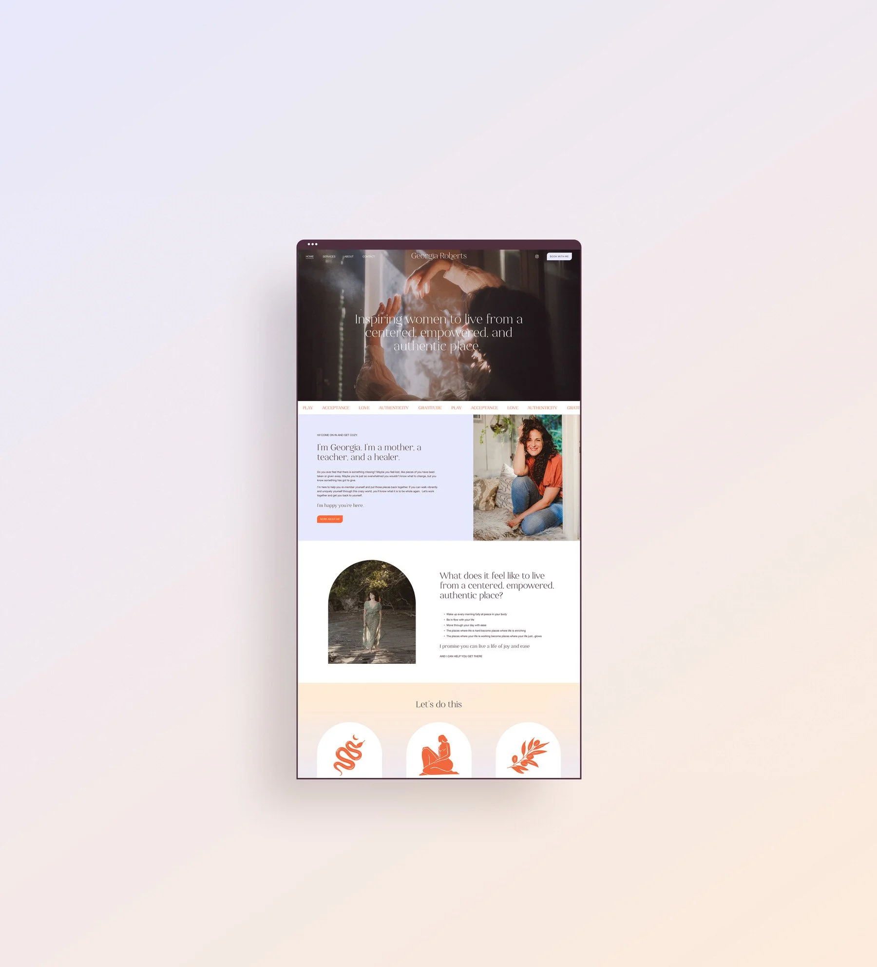 The Georgia Roberts logo has been purposefully designed using a lowercase serif style typeface with sharp features to give it a dynamic and high end feel. A small crescent moon in place of the traditional dot on the letter "i" serves as a charming touch that adds a magical and warm element to the design, promoting a sense of calm and ease. The use of a vibrant colour palette promotes an empowering and playful feel that resonates with a feminine energy, while also creating a sense of positive wellbeing and self-love - key values that are integral to the brand's story.