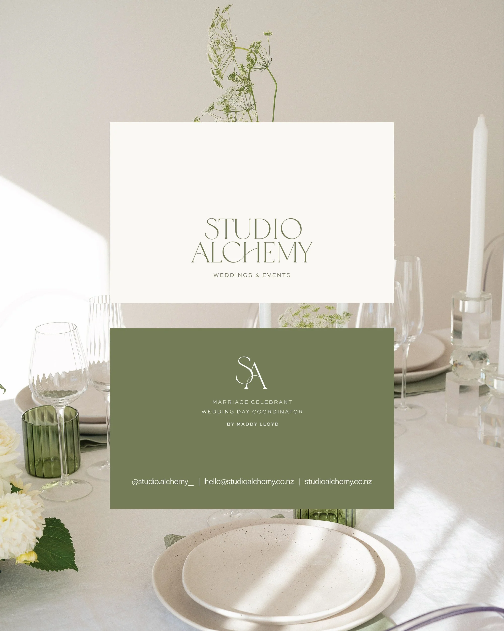 For Studio Alchemy, the creative direction was rooted in elegance with a heartbeat. Timeless and refined, but never cold. Founder Maddy's warmth, wit and ability to make couples feel completely at ease became the north star for every design decision. The brand needed to feel like the experience itself: sophisticated enough to command trust, personal enough to feel like a friend. A muted, natural palette lays the foundation of calm and composure, while the serif logotype brings a quiet femininity and a sense of occasion. The monogram emblem, stitched from the letters S and A, creates a subtle, intimate mark that feels like a personal seal, nodding to the bespoke nature of Maddy's service. Where the branding breathes restraint, the imagery brings the magic β vivid, joyful, full of life, a visual reminder that behind every polished ceremony is a day full of laughter, champagne and pure, unscripted love.